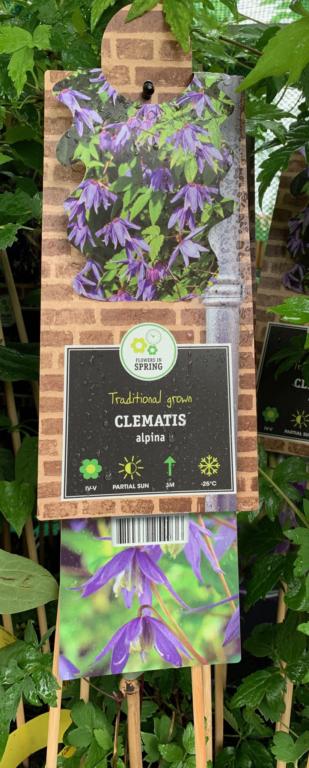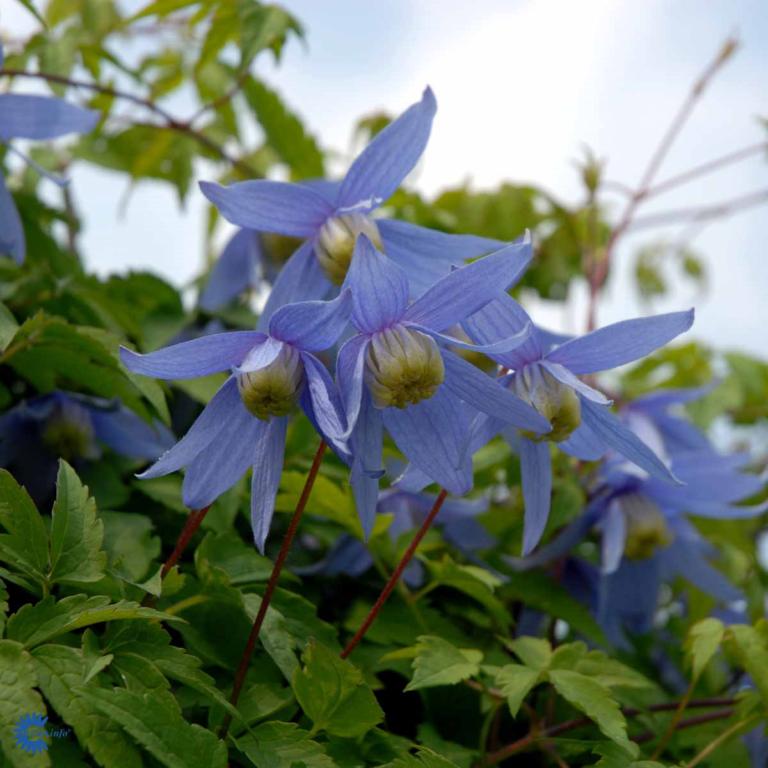 Clematis alpina. Har klokkeformede blomster i forskellige farver alt efter sort. Tåler megen skygge.