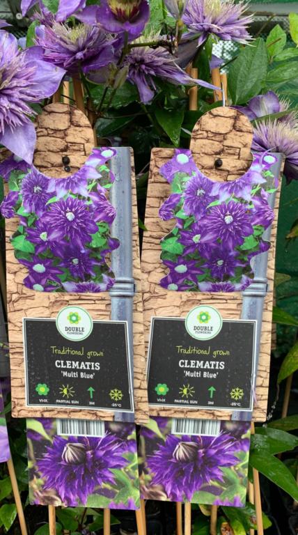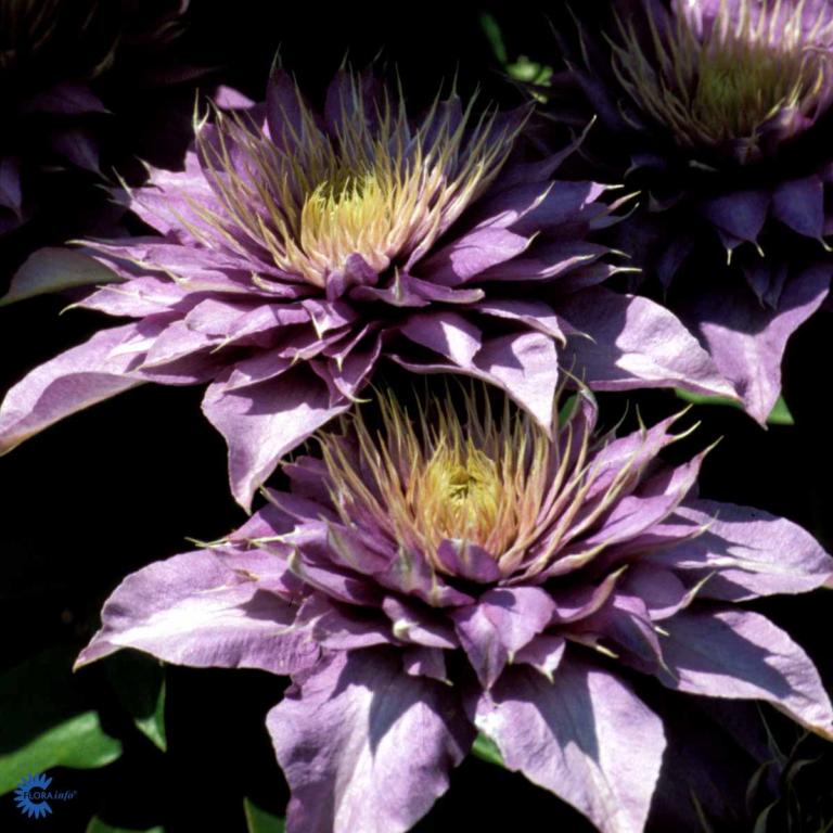 Storblomstret hybrid. Mørkeblå fyldte blomster i juni-juli. I september enkle blomster fra nye skud.