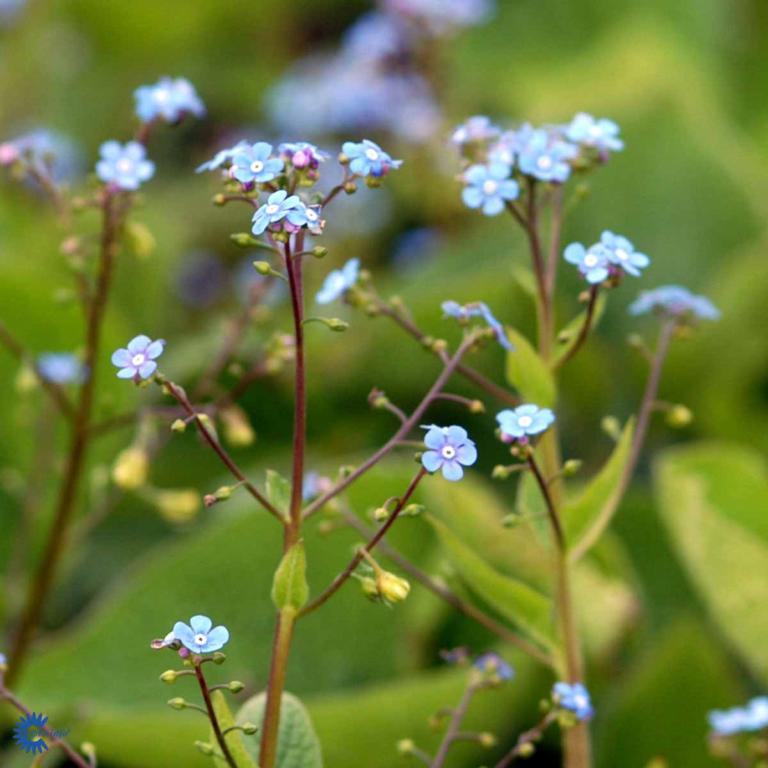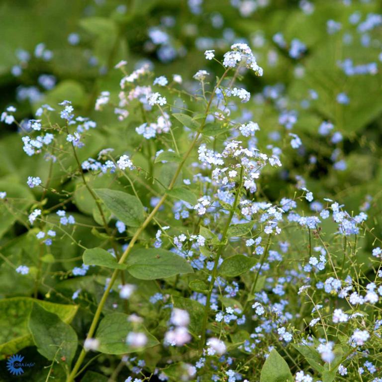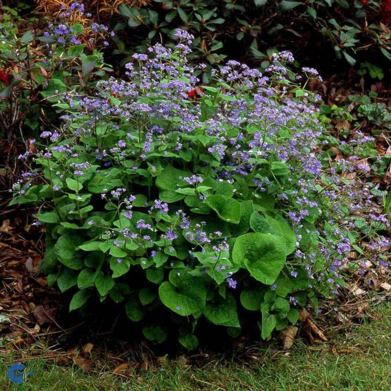 Lav staude, 40 cm Store ruhårede, hjerteformede blade Små klartblå blomster i lette blomsterstande. Blomstrer i april-juni. Svagt duftende Sol og skygge Sommer bunddække